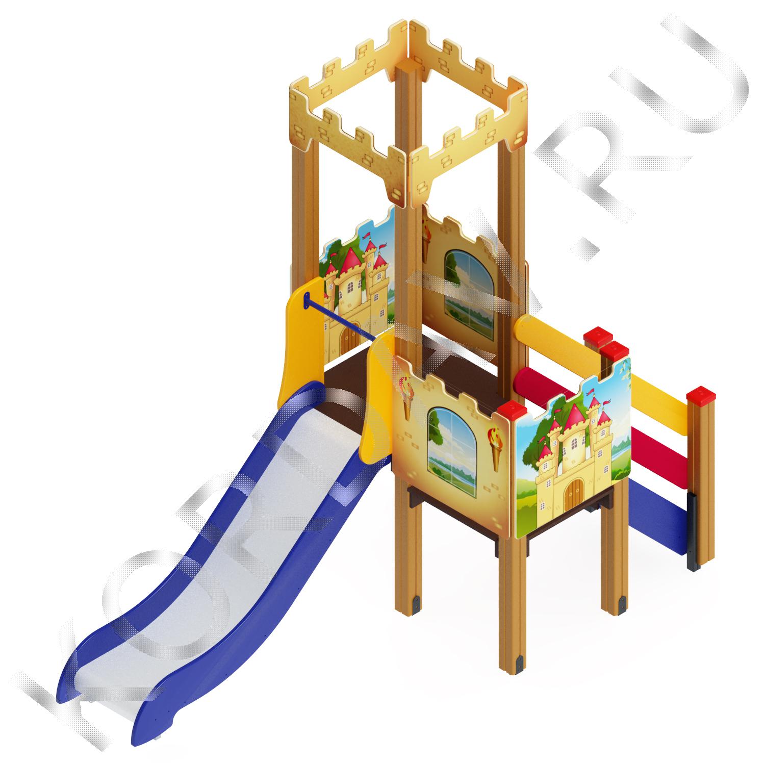 Детский спортивно-игровой комплекс включает в себя горку-башенку и лестницу. Комплекс очень компактный может разместиться даже на не большом участке.